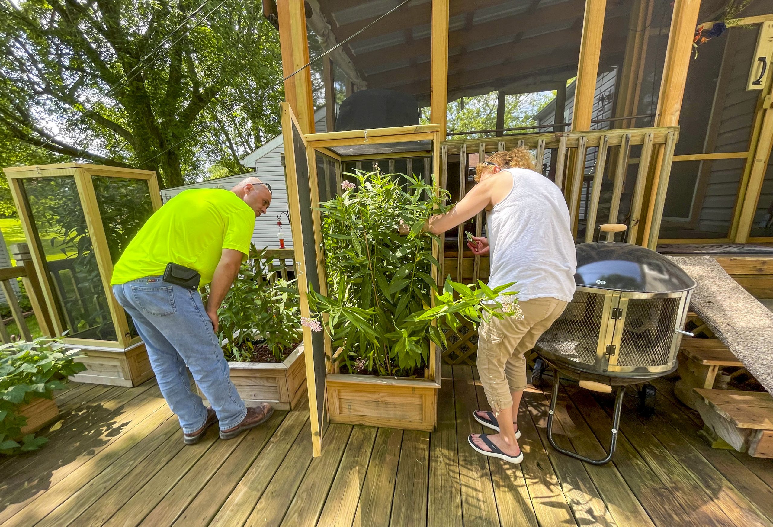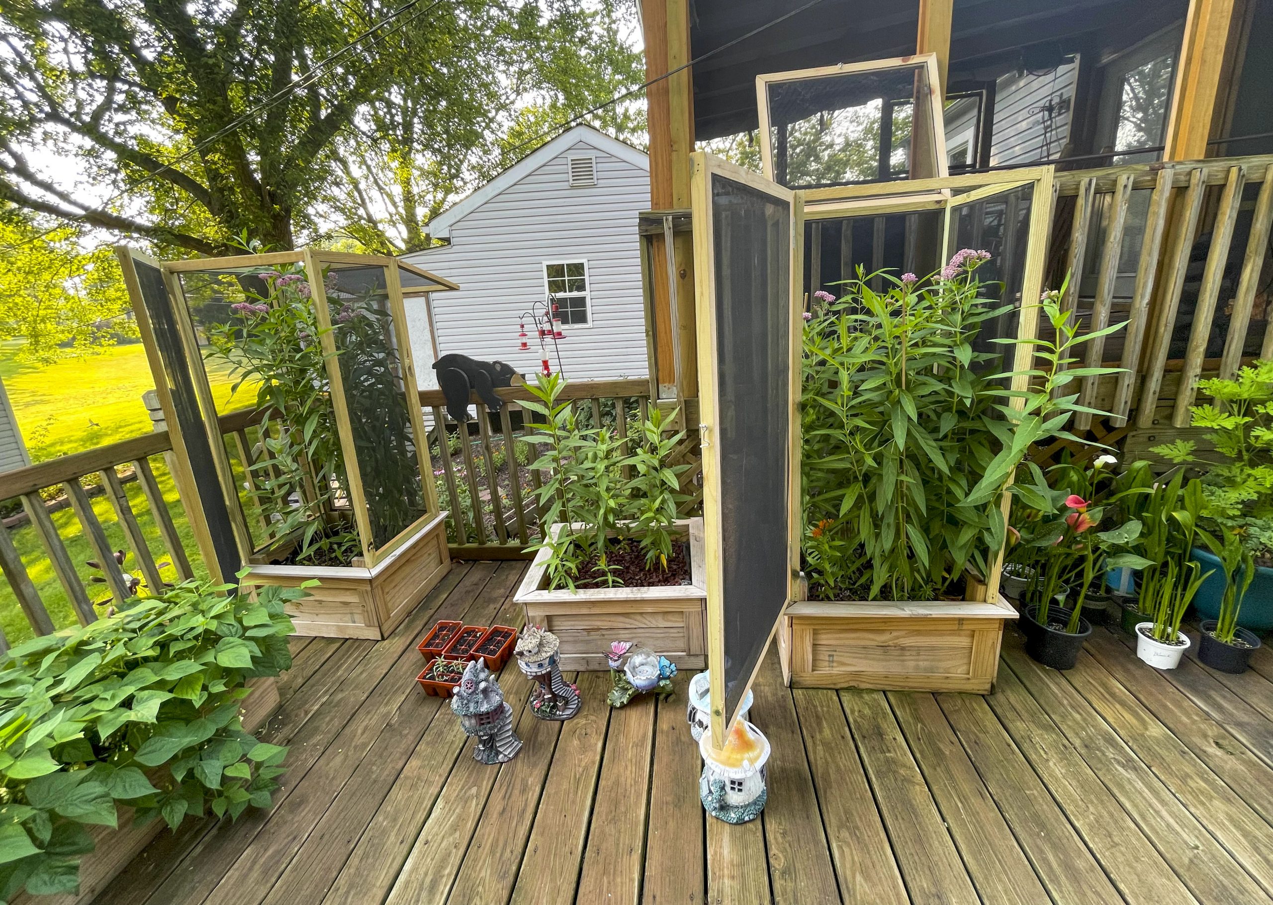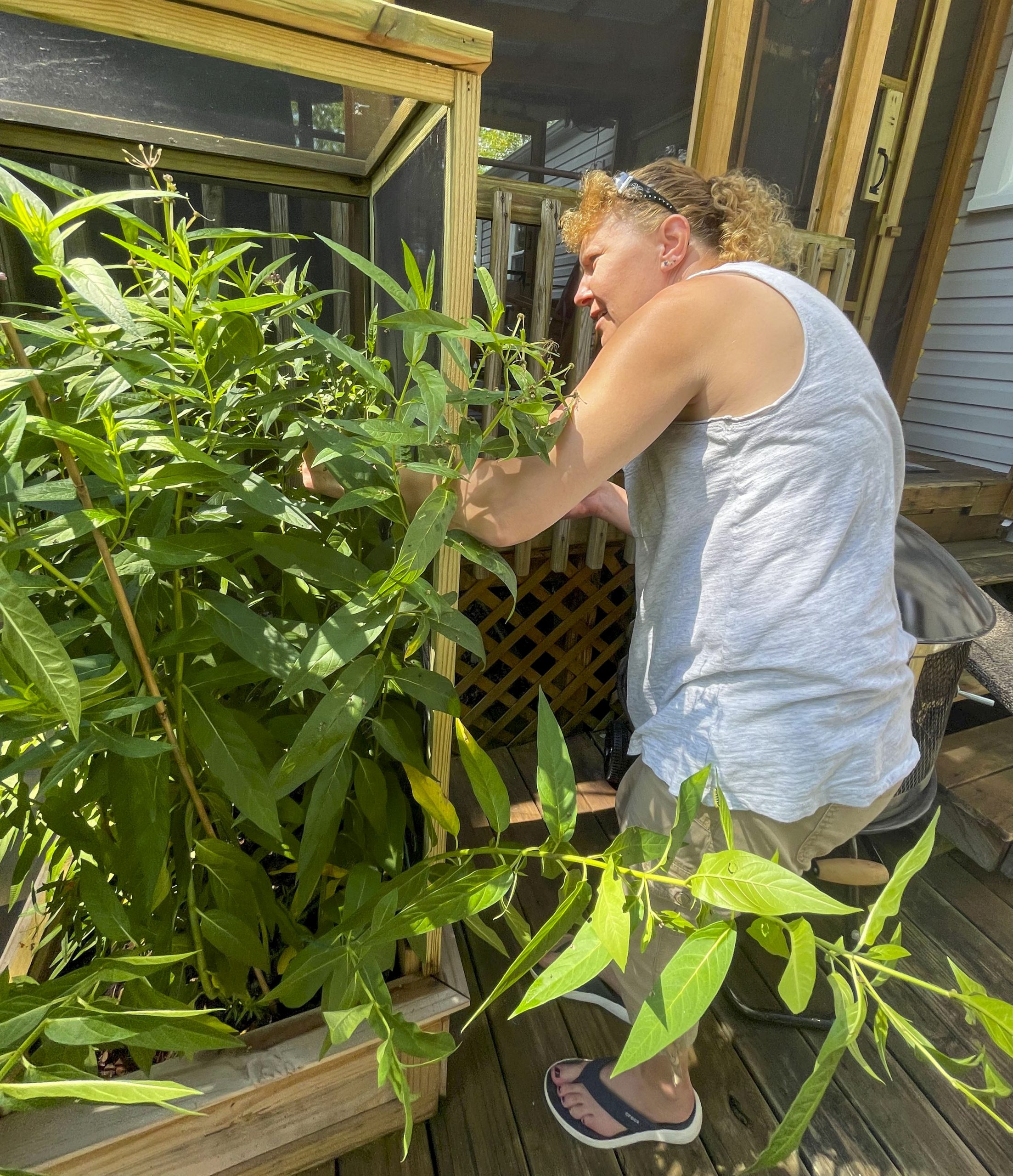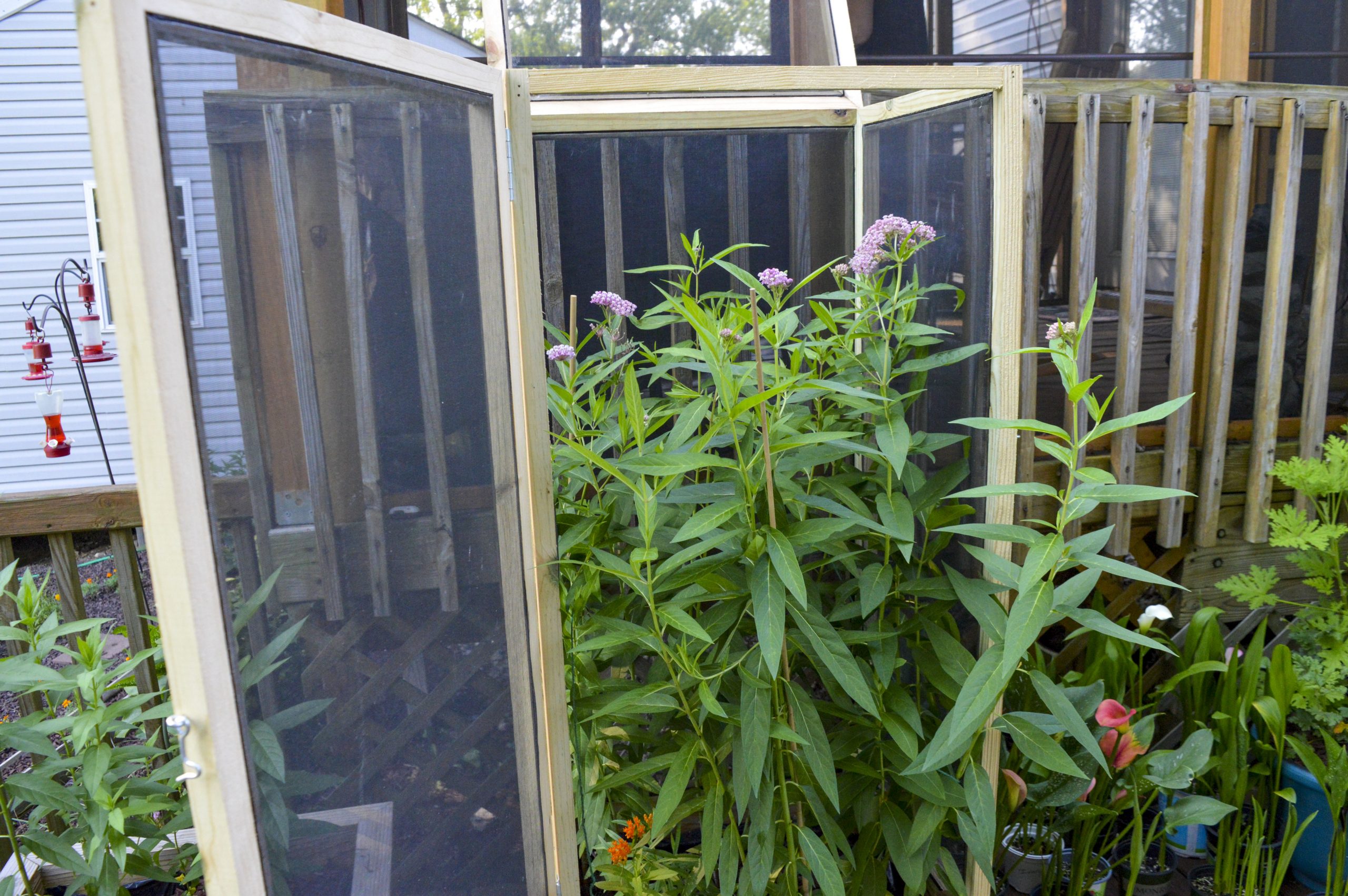- Goble’s porch and set up for her monarchs. Majority of the plants are milkweed.