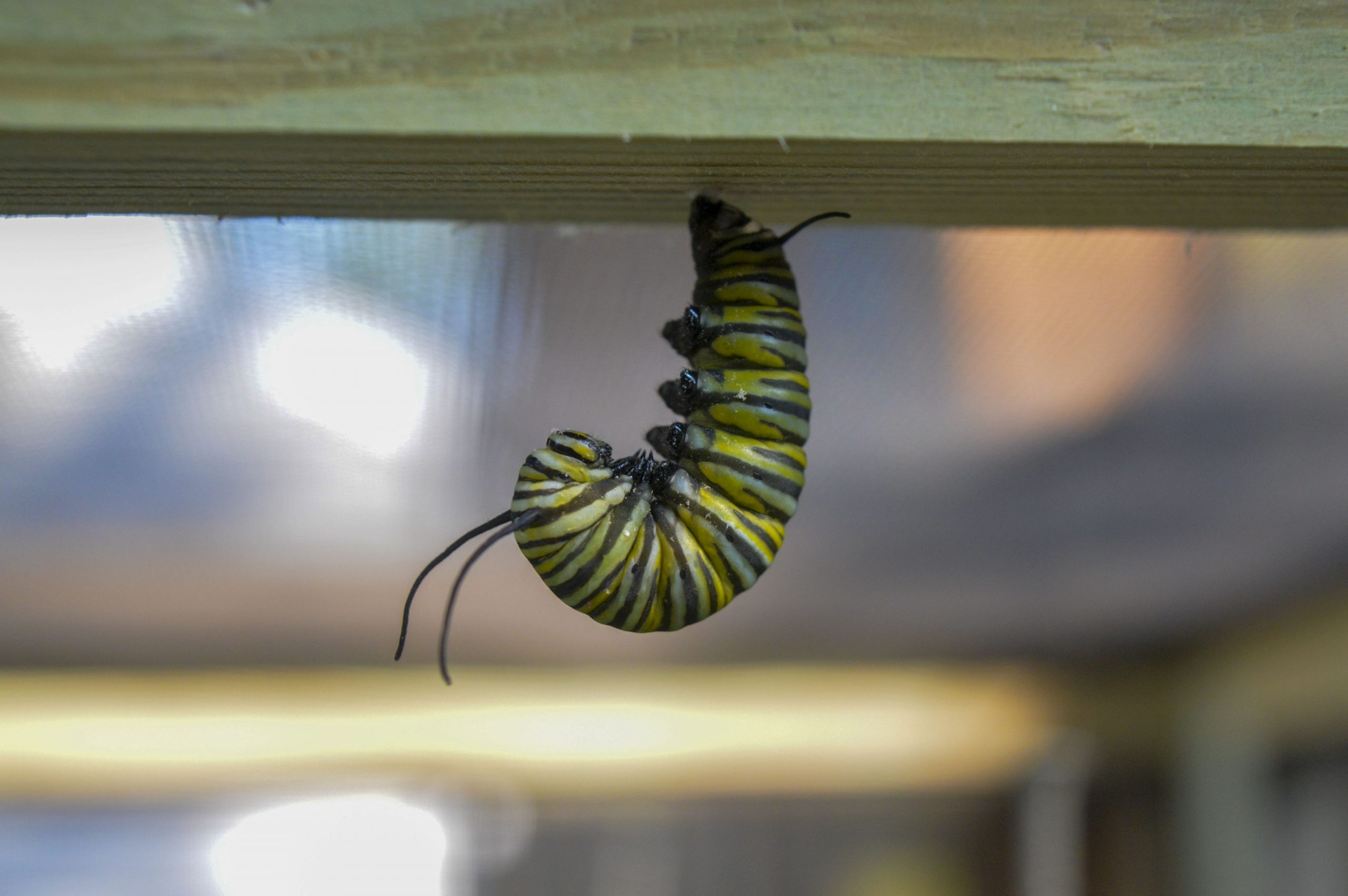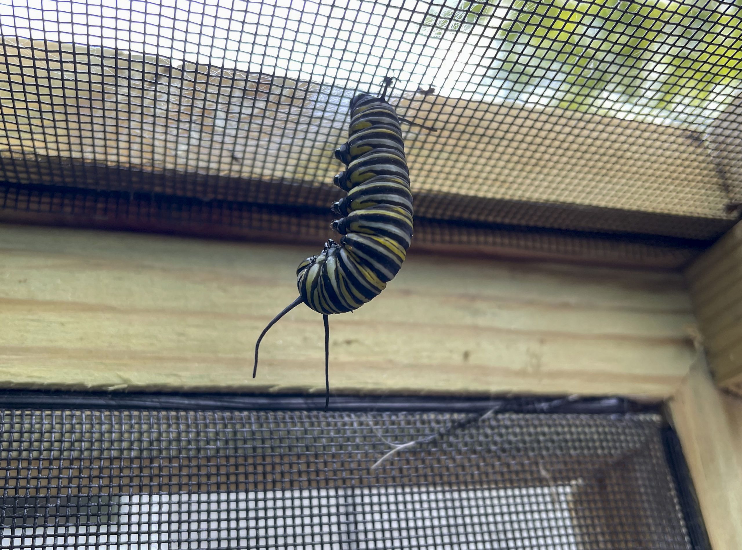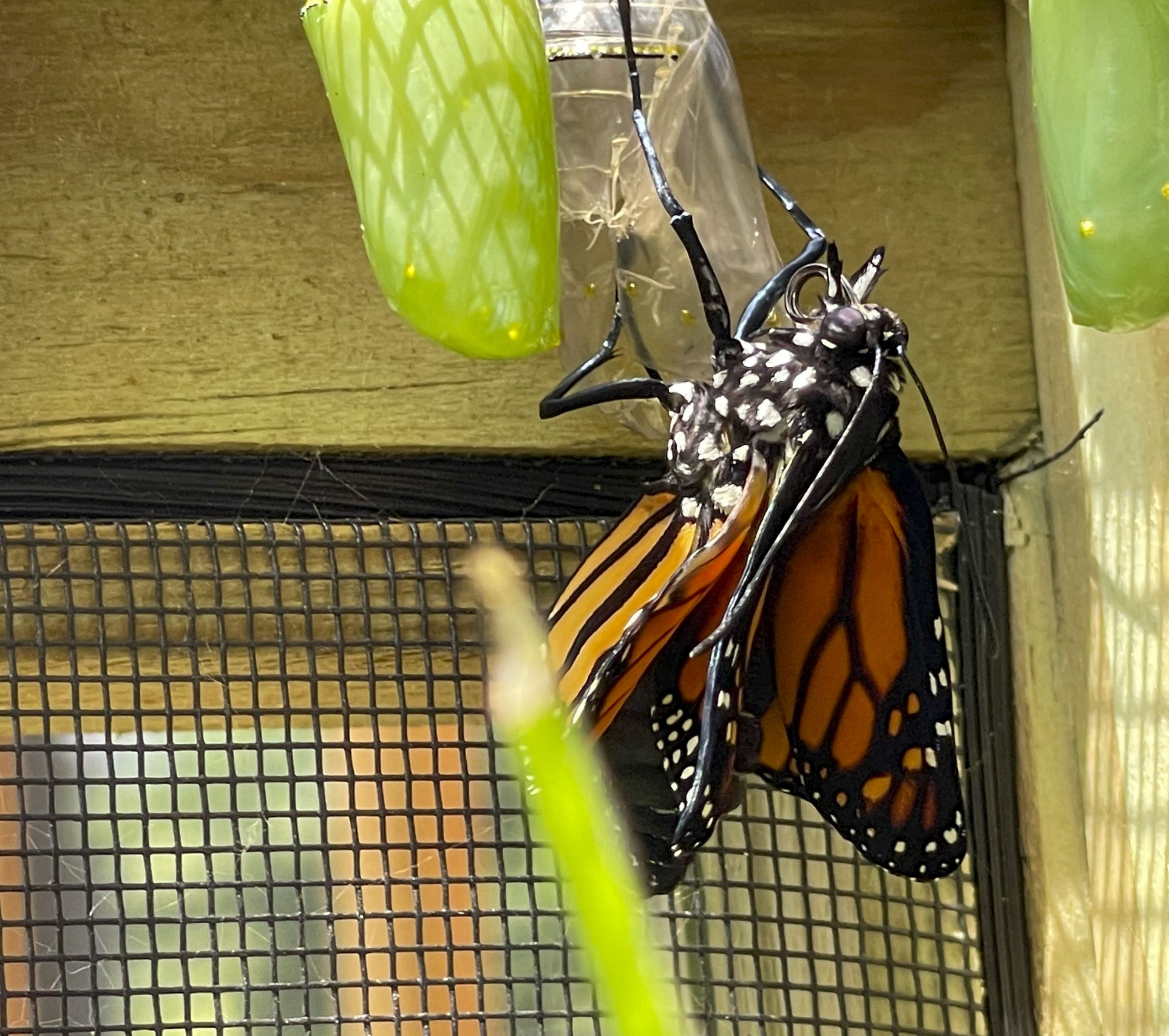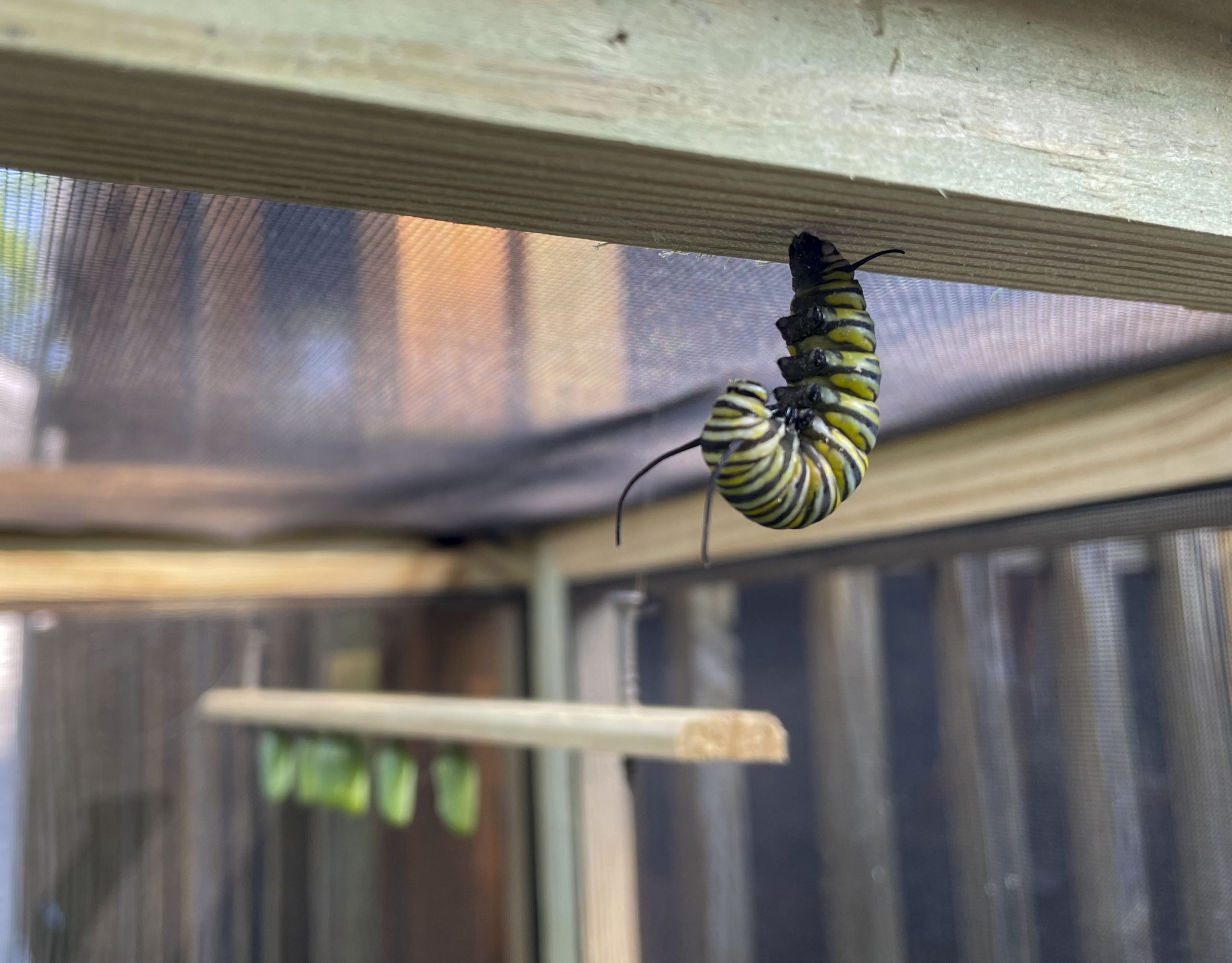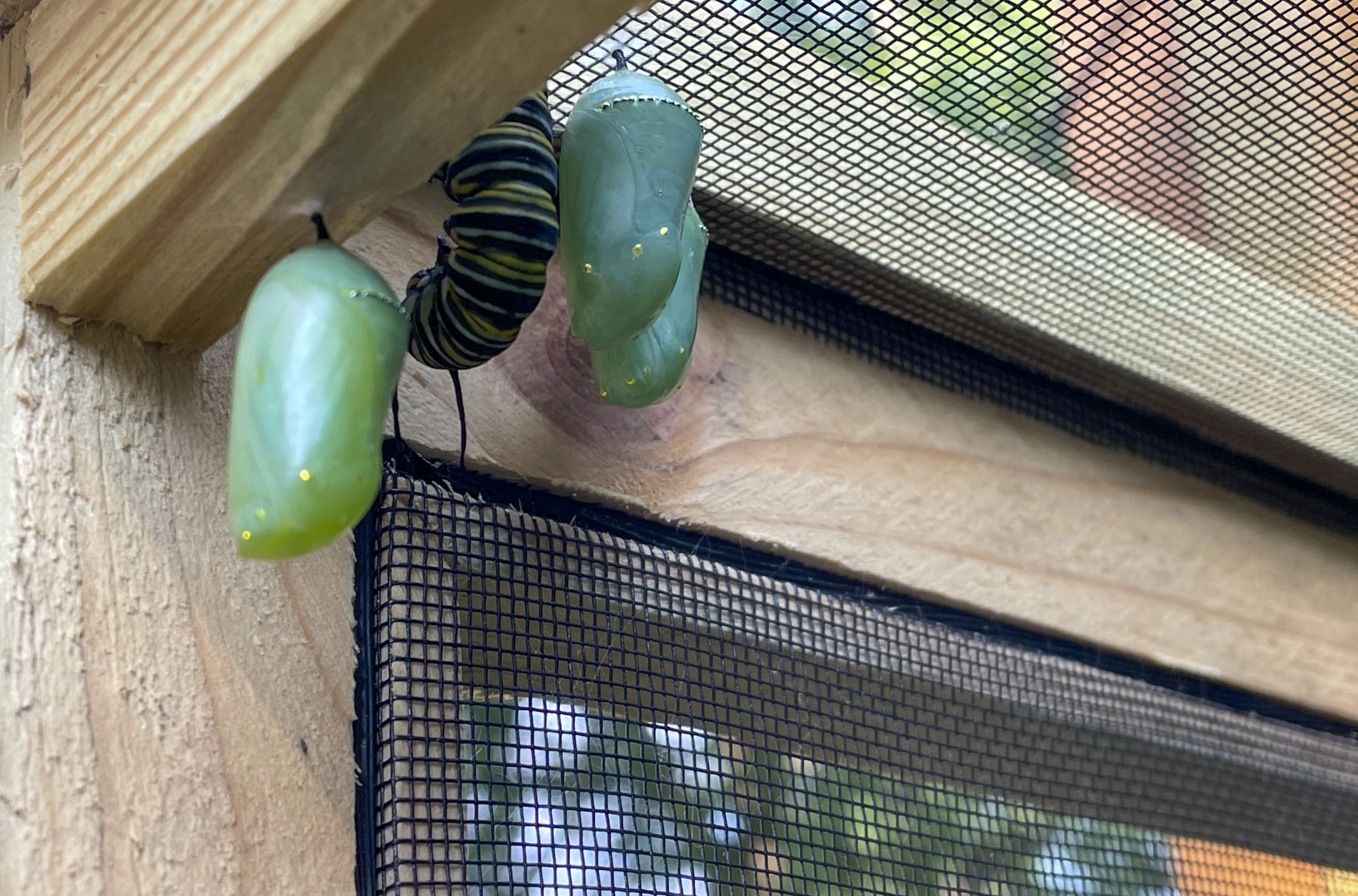 Goble starts her process in the spring to make sure the milkweed is growing and plant more if needed. In July, the monarchs start showing up for nectar and begin laying eggs on the plants. She then watches for caterpillars and takes them to the cages to finish growing. It takes about fourteen to twenty days for them to eat before creating a J with their bodies and forming a cocoon. The cocoon will hatch within seven to nine days.