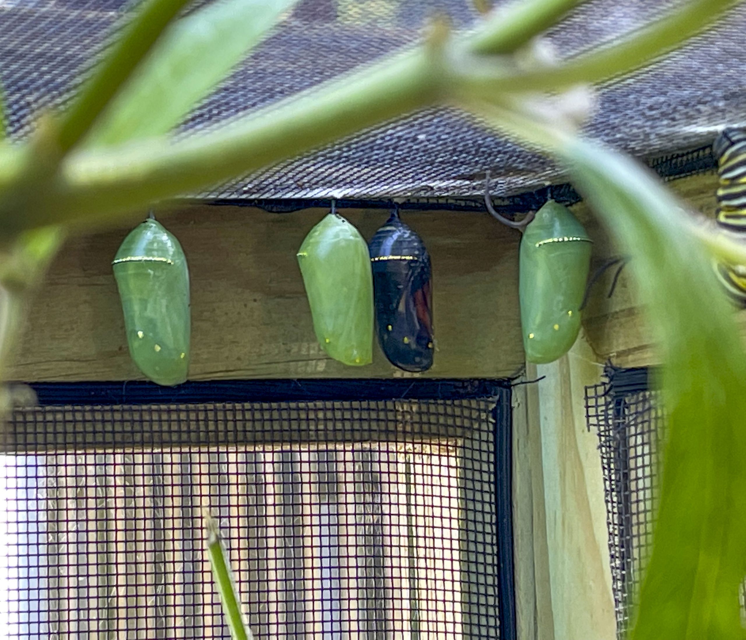 - Four cocoons hang in the corner of one of the cages July 28, 2021. One of the caterpillars just turned into a cocoon and is brighter green than the others.