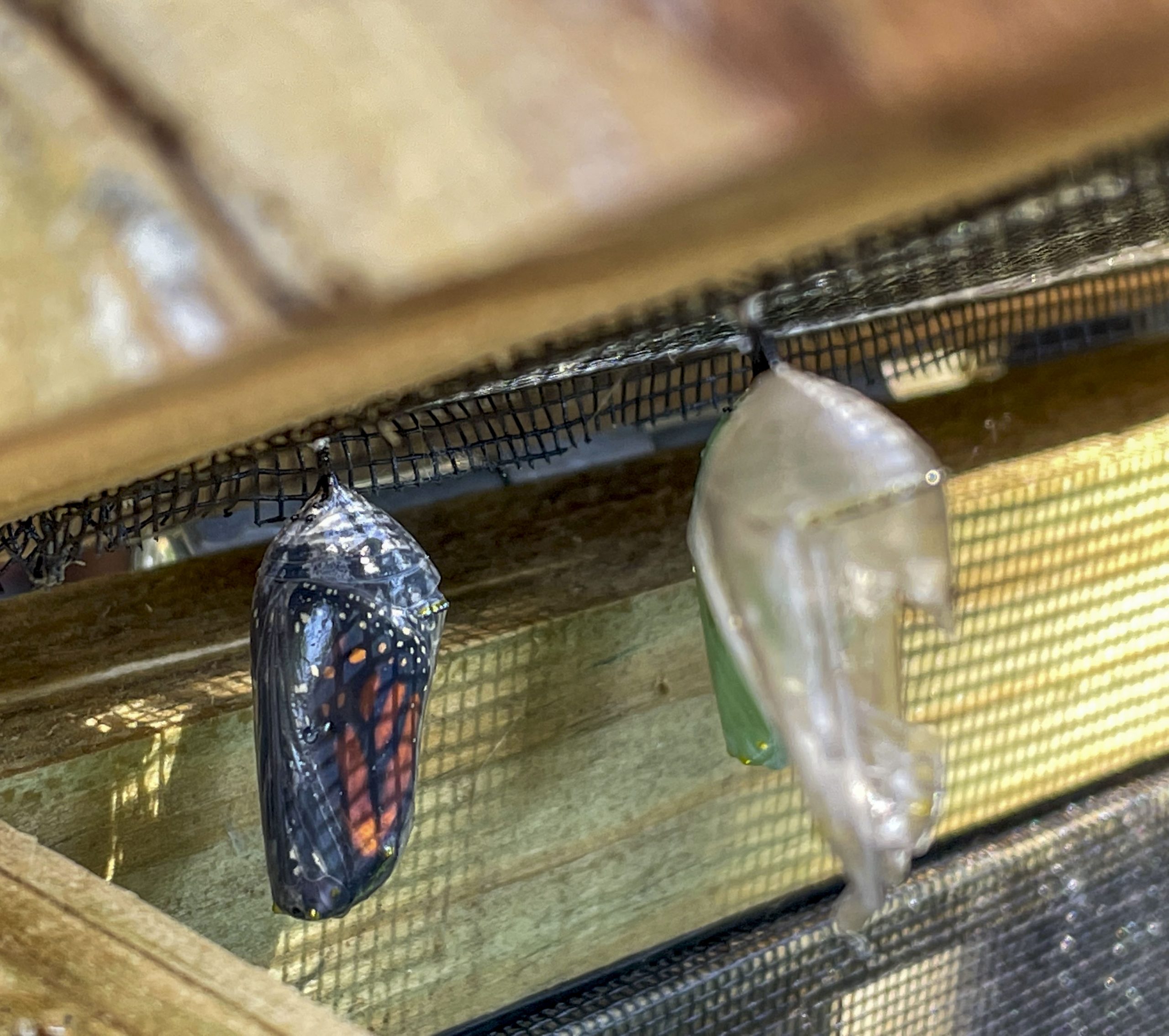 - A monarch nears hatching August 2, 2021. The cocoons turn clear right before the butterfly hatches.