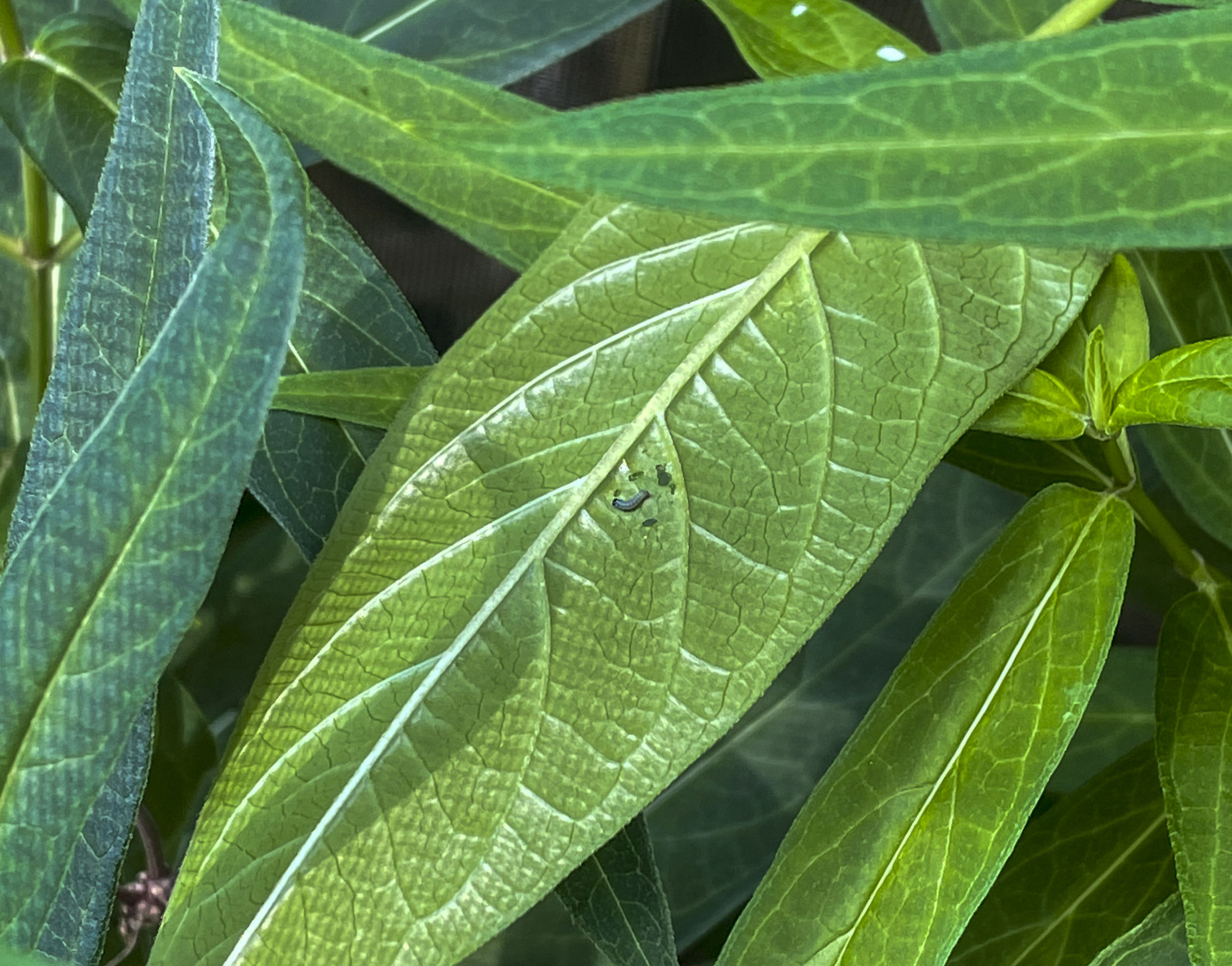 - A tiny caterpillar on a leaf inside Goble’s cage July 18, 2021. The caterpillar recently hatched from its egg and begins eating the plants.